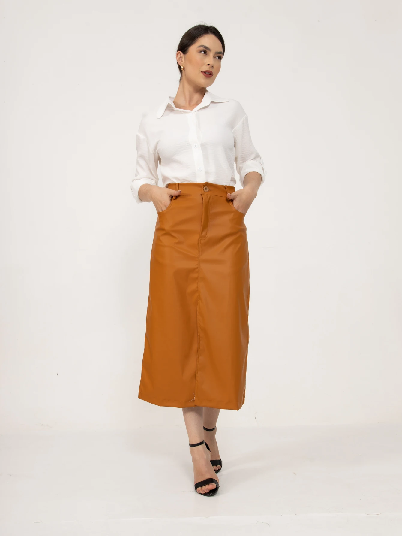 Descubra a elegância e versatilidade desta Saia de Couro Sintético Preta. Com seu design e unico centralizado na frente com fenda frontal, esta saia é a peça ideal para elevar o seu estilo.