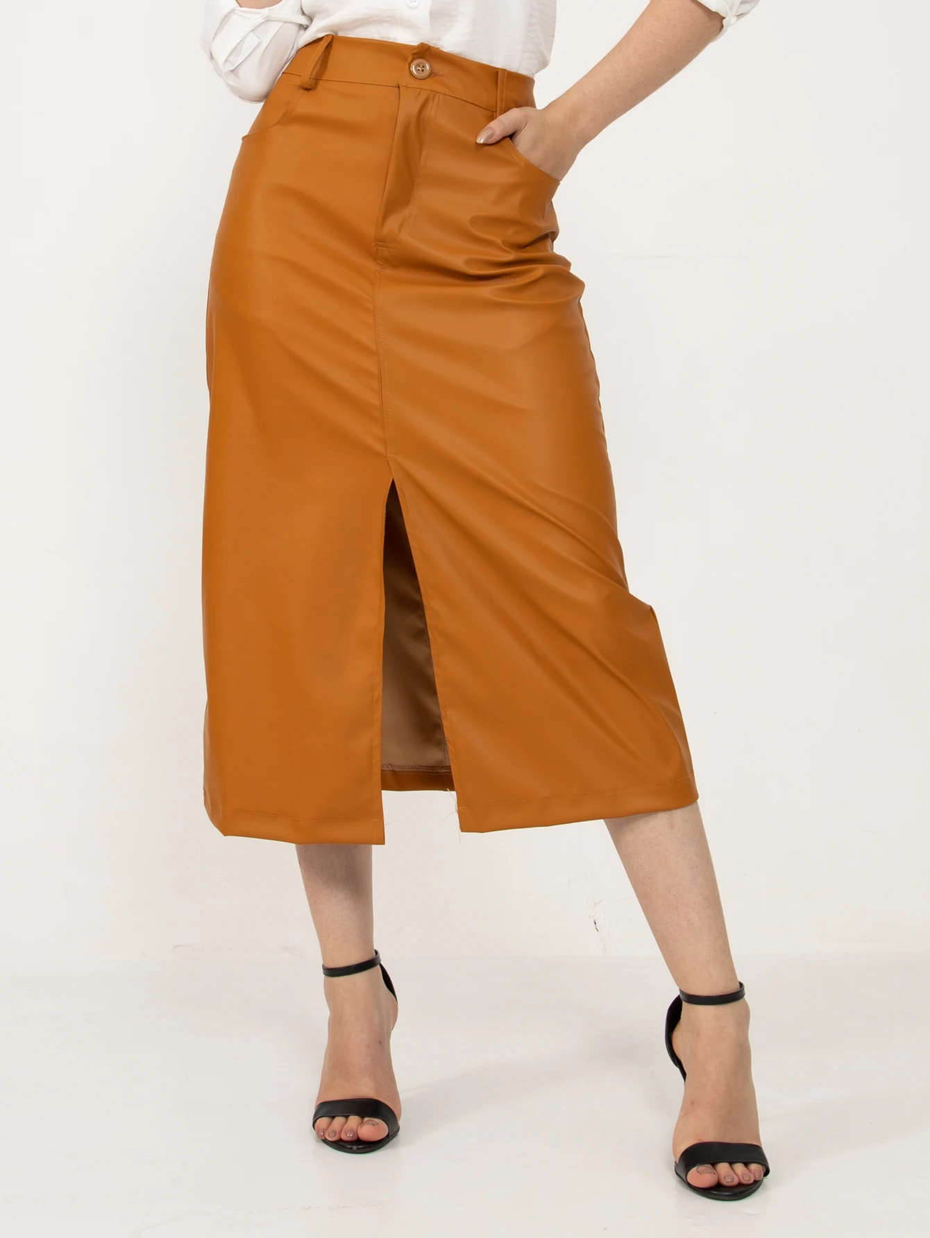 Saia Feminino de Couro Sintetico com Fenda Frontal.